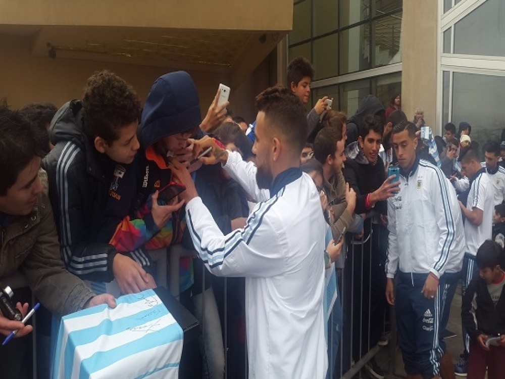 Desde la noche del jueves que cientos de hinchas de la Selección se amontonaron en la puerta del hotel Del Bono, donde descansó la delegación argentina. Y tanta vigilia y amor tuvo su recompensa. Luego de almorzar, varios jugadores se acercaron a los fans para firmarles autógrafos, sacarse fotos y agradecerles el aguante.