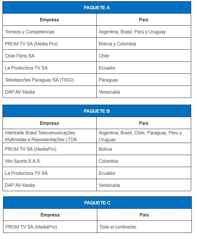 La Confederación Sudamericana de Fútbol -CONMEBOL- informa que como resultado de un proceso de licitación abierto y competitivo, con la participación de una pluralidad de oferentes, y la evaluación técnica de las ofertas recibidas, el Consejo finalizó hoy el proceso de adjudicación de contratos en tres áreas de servicios para la producción televisiva de las competencias de clubes continentales para el ciclo comercial 2019-2022, incluyendo la CONMEBOL Libertadores, la CONMEBOL Sudamericana y la CONMEBOL Recopa.