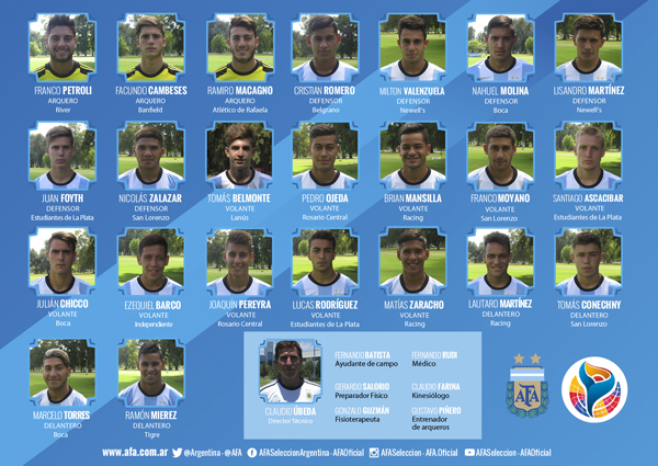 Estamos a pocos días del debut argentino en el Sudamericano Sub 20 de Ecuador (será frente a Perú, el 19/1 a las 21.15, hora argentina). Y ya quedó definido el plantel que representará a la Selección en el torneo que entrega cuatro plazas para la Copa del Mundo, a desarrollarse en Corea del Sur entre mayo y junio. ¿Querés conocer a los 23 citados por Claudio Úbeda y su equipo de trabajo? Pasá y anotá. ¡Y empezá a alentar!