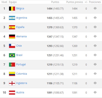 La Selección Nacional acumula un total de 1455 unidades en el ranking del máximo ente organizador del fútbol mundial. Así, pues, no se baja del podio en la tabla estadística y se posiciona cómo el mejor seleccionado del continente americano. El conjunto belga se mantiene como líder, contabilizando 1494 puntos. Por su parte, los españoles suman 1370 unidades.