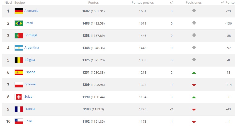 Con 1348 puntos, la Selección Argentina se ubica en el cuarto puesto del ranking del mes de noviembre. Alemania ocupa el primer lugar (1602 puntos). En la segunda posición se encuentra Brasil, con 1483 unidades, y en tercera Portugal, con 1358.