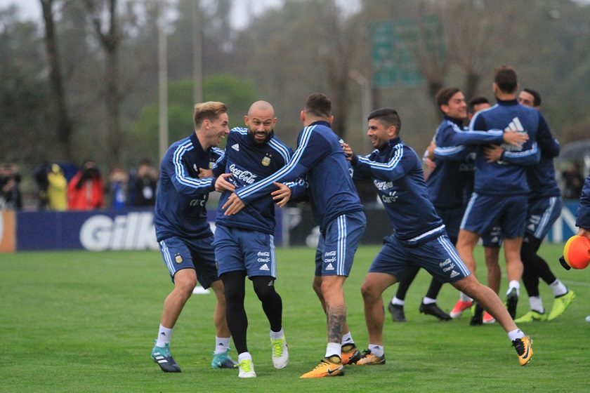 El equipo nacional, dividido en dos grupos, empezó sus labores pasadas las 17 y bajo las órdenes del Profesor Jorge Desio. Ejercitaron velocidad y reacción por postas a modo de entrada en calor. Tras ello, Jorge Sampaoli hizo táctico con los sparrings durante 40 minutos. Una vez culminada la práctica de los primeros, el resto se sumó e hizo el mismo circuito de tareas.