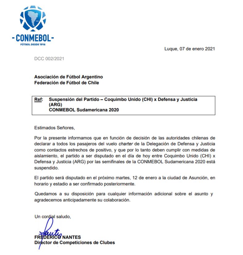 En función de la decisión de las autoridades chilenas de declarar a todos los pasajeros del vuelo chárter de la delegación de Defensa y Justicia como contactos estrechos de positivo, y que por lo tanto deben cumplir con medidas de aislamiento, el partido agendado el día de hoy entre Coquimbo Unido (CHI) vs Defensa y Justicia (ARG) por las semifinales de la CONMEBOL Sudamericana 2020 está suspendido.