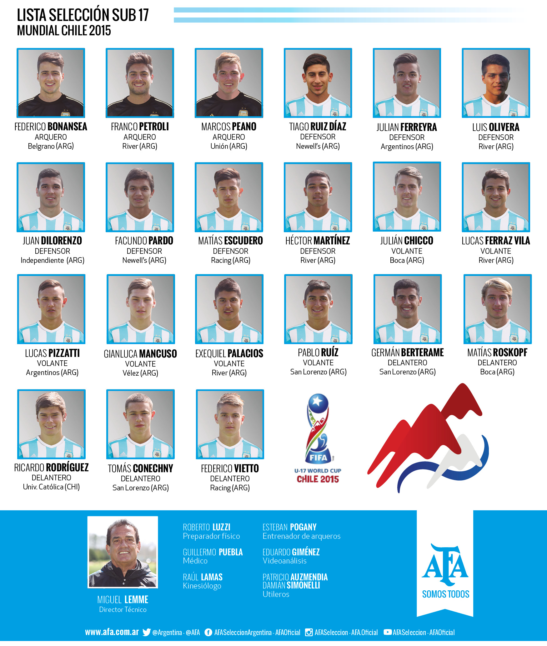 La Selección Argentina ya tiene confirmados a los 21 futbolistas con los que participará en la Copa del Mundo Chile 2015, luego de que Miguel Ángel Lemme, el entrenador del equipo, anunciara la lista la semana pasada.