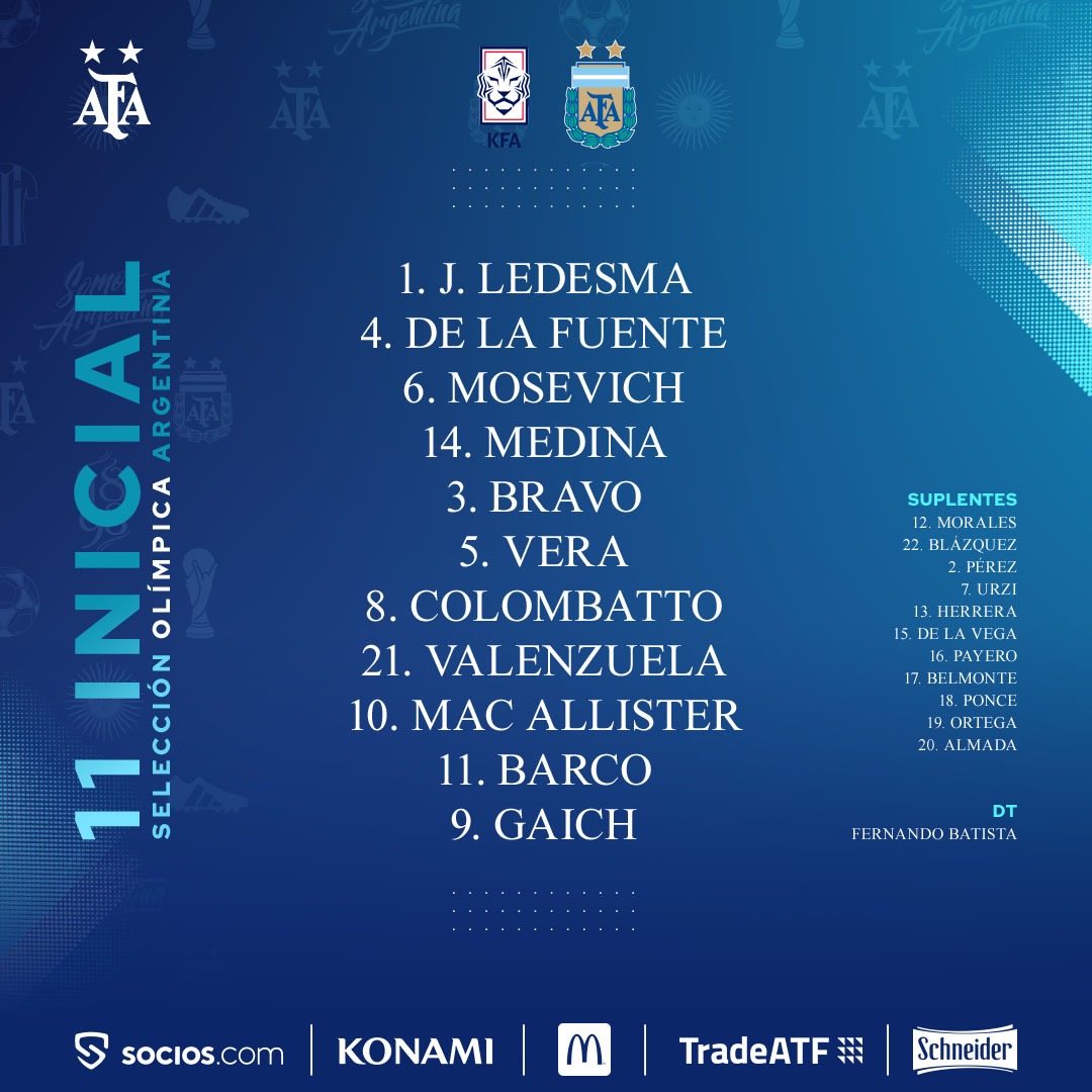 Y en el primer tiempo Argentina se puso en ventaja a los 11 minutos, tras gran recuperación cerca de mitad de cancha de Adolfo Gaich y un remate potente de Alexis Mac Allister que se coló por el primer palo defendido por el arquero coreano. A los 35', en tanto, igualó las acciones Lee Donggyeong, con otro tiro fuertísimo que venció a Jeremías Ledesma.