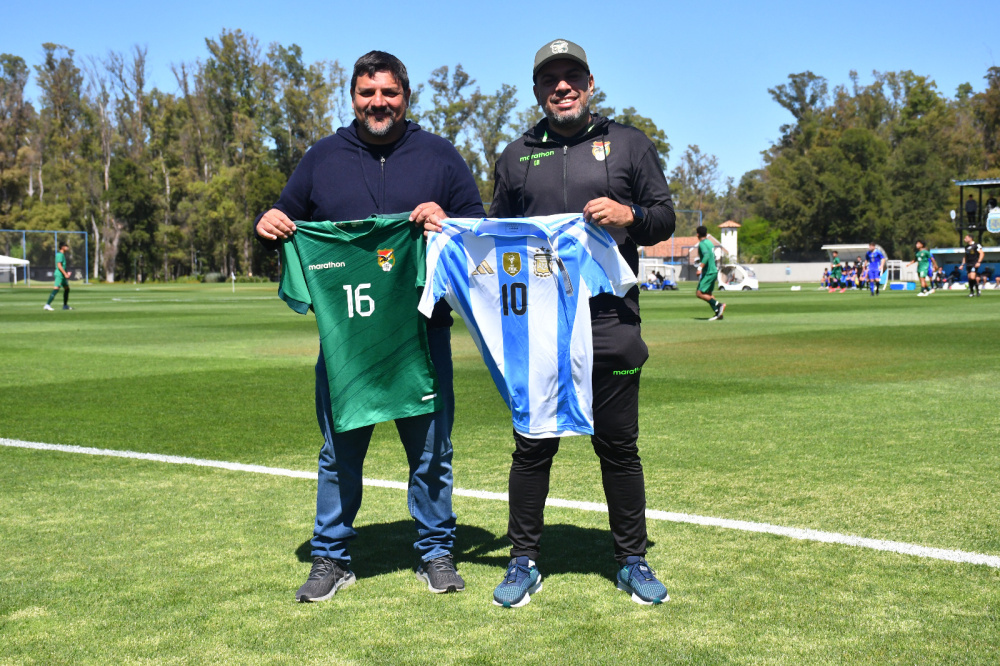 José Luis CuCoutinho, dirigente de AFA a cargo de la disciplina, intercambió camisetas con el técnico de la selección boliviana, Gabriel Ramírez.