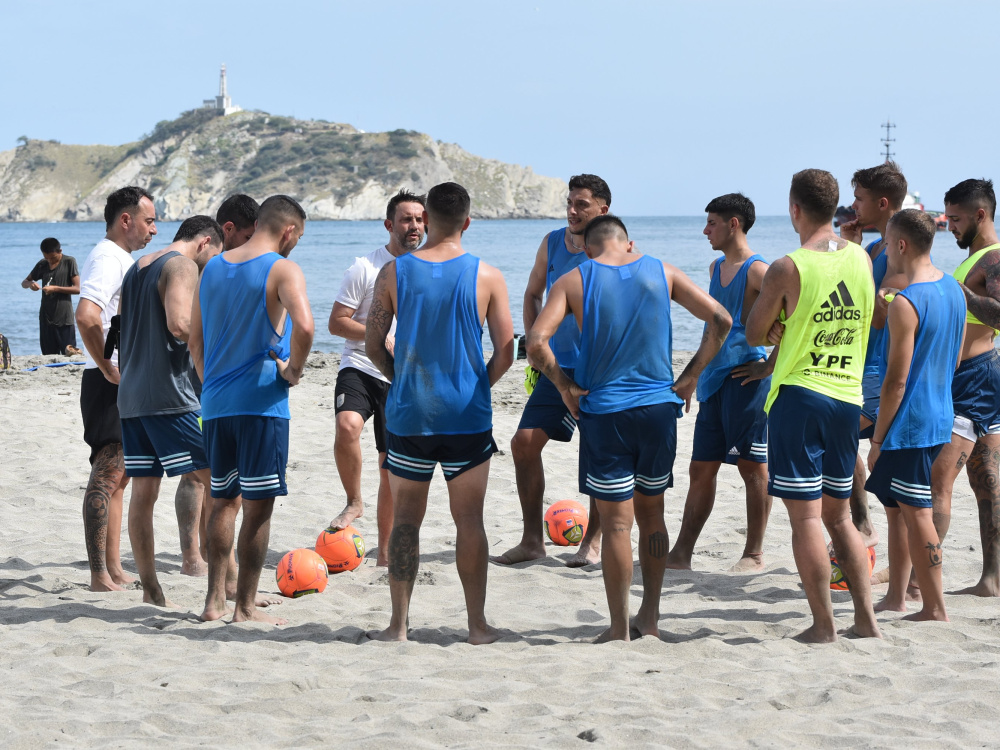 El plantel trabajó en un espacio armado, adecuando el juego a las medidas de la cancha que tendrá la competencia, 25x35 metros, y las características de la arena.