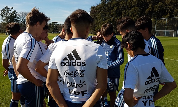 Desde las 9.30, los juveniles albicelestes salieron al césped para desarrollar una sesión de técnica individual y ejercicios tácticos en espacios reducidos.
