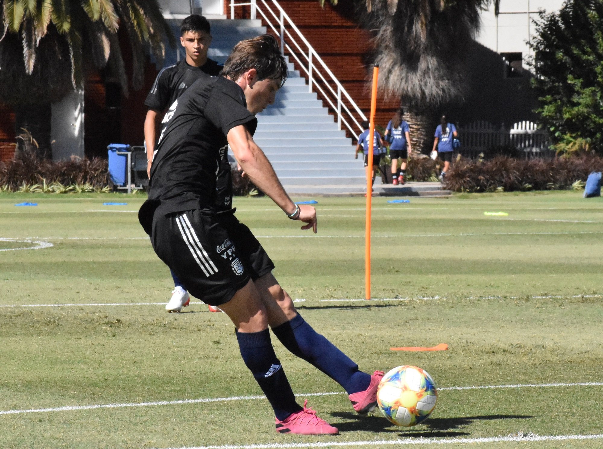 El seleccionado conducido por Pablo Aimar retornó al campo de juego del Predio de Ezeiza. Y el turno matutino de miércoles completó tres jornadas de actividades en las que la intensidad fue aumentando gradualmente. En la última sesión de la semana el plantel inició sus tareas con un ejercicio recreativo que combinó comunicación, coordinación y precisión, con el cabezazo como arma principal de trabajo. Acto seguido, rondo con superioridad ofensiva y variantes, que fue sucedido por un bloque táctico posicional establecido conforme a un circuito de pases con la pretensión de aceitar el funcionamiento colectivo y los movimientos creativos. En el cierre, fútbol 11 vs 11 en toda la cancha, con modalidad continua y algunos fragmentos fraccionados para marcar pautas conceptuales.