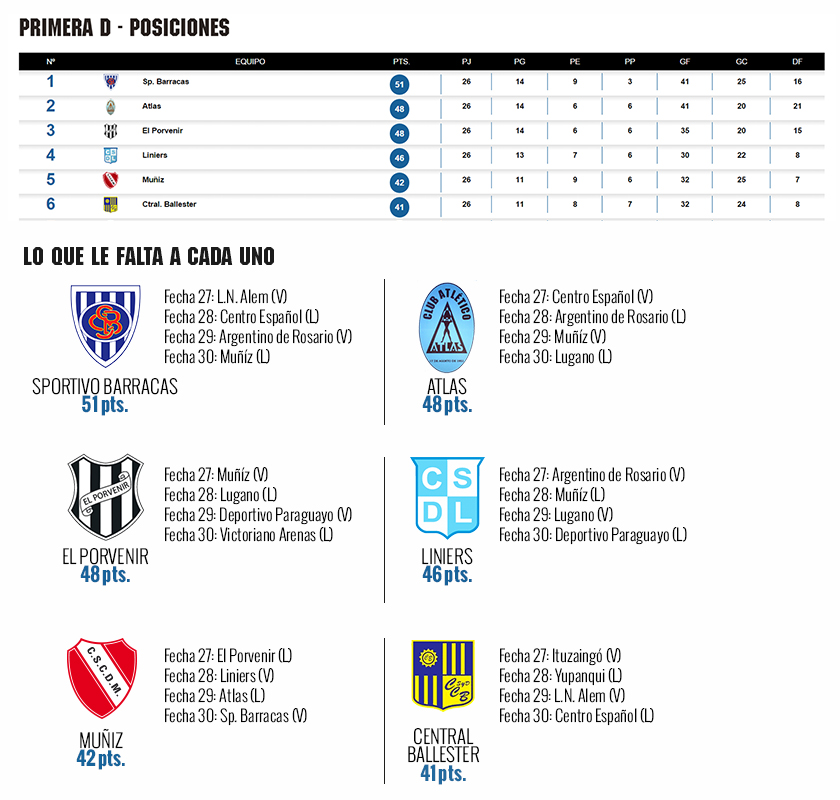 El campeonato de Primera D está llegando a su ocaso, ya que sólo cuatro fechas lo separan del final y la definición está más caliente que nunca. Los primeros seis equipos ubicados en la tabla de posiciones tienen chances matemáticas de coronarse campeón, obteniendo así el único ascenso a Primera C. ¿De quiénes hablamos? De Sportivo Barracas, Atlas, Liniers, El Porvenir, Muñiz y Central Ballester.