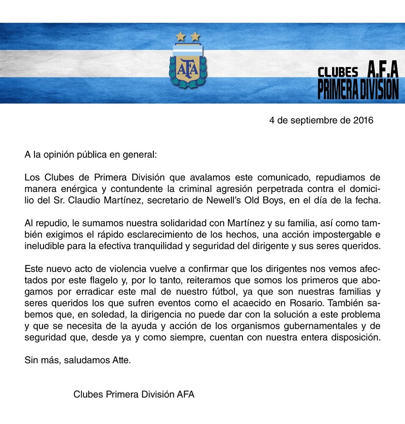 El Comité de Regularización de la Asociación del Fútbol Argentino transmite su solidaridad para con el señor Claudio Martínez, secretario del Club Atlético Newell’s Old Boys, tras los violentos acontecimientos que sufrió el pasado día domingo en su domicilio, en la ciudad de Rosario. La AFA se suma al repudio expresado por los dirigentes de Primera División hacia el accionar delictivo y manifiesta su colaboración hacia las autoridades del Club Atlético Newell’s Old Boys con el objetivo de generar un espacio de trabajo con las autoridades de Seguridad Deportiva de la Nación.