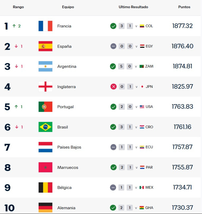 Francia (1.ª, +2) protagoniza el movimiento más significativo. Tras vencer sus dos encuentros amistosos de este último periodo, escala a lo más alto de la clasificación, un puesto que no lograba desde septiembre de 2018, y supera a España (2.ª, -1) y Argentina (3.ª, -1) con una mínima diferencia de puntos entre las tres. La actual campeona de Europa se vio penalizada por el empate de este martes con Egipto (29.ª, +2) y deja un primer puesto que ocupaba desde septiembre de 2025.
