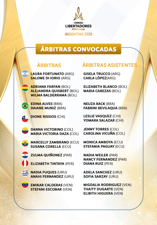 Son 38 árbitras y árbitras asistentes las designadas para la CONMEBOL Libertadores Femenina. Por primera vez el torneo contará con el Sistema de Asistencia Arbitral por Video (VAR) en la totalidad de sus partidos.