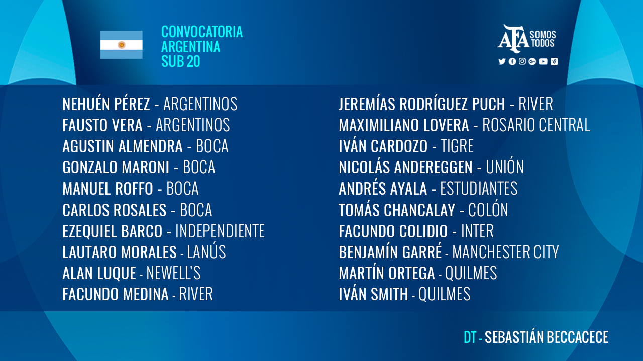 Sebastián Beccacece, entrenador del seleccionado argentino juvenil Sub 20 y actual integrante del cuerpo técnico de Jorge Sampaoli, convocó a los siguientes jugadores que viajaron como grupo de apoyo para los amistosos ante Rusia y Nigeria.