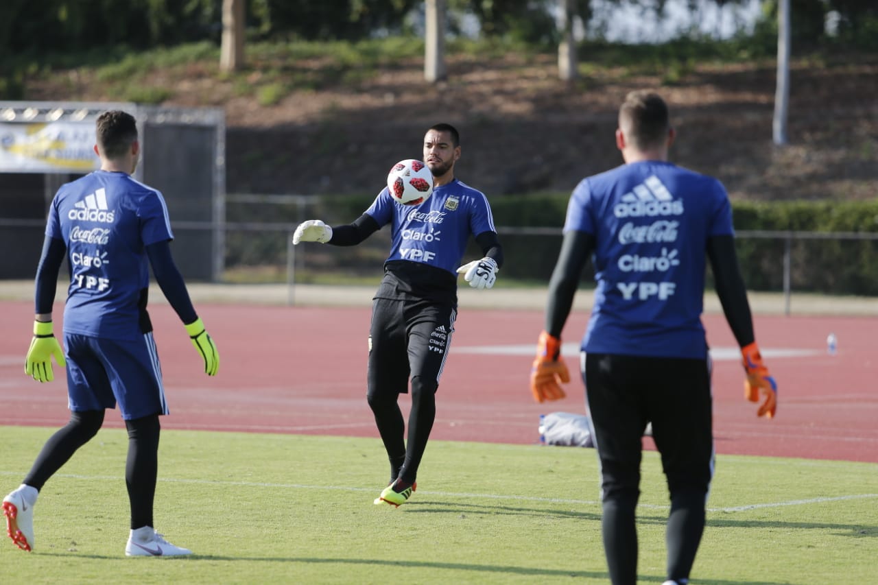 Los guardavallas Sergio Romero, Franco Armani y Gerónimo Rulli hicieron movimientos típicos del puesto con el preparador Martín Tocalli.