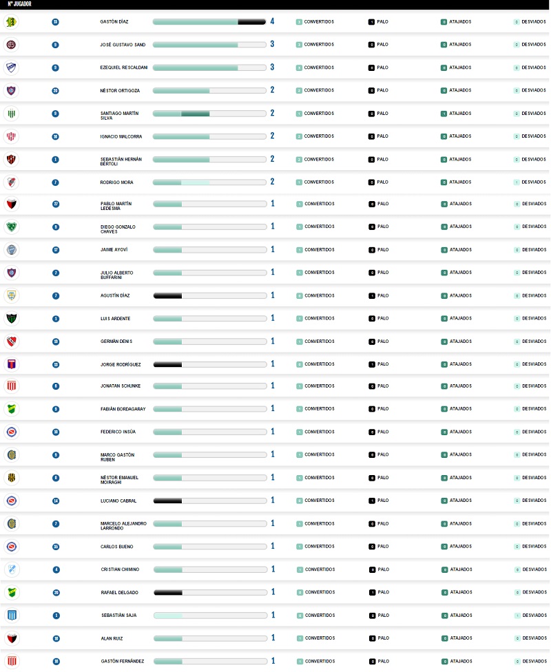En cuanto al récord individual, Gastón Díaz, de Aldosivi, aparece en el primer lugar de la tabla de pateadores de penales: tres convertidos sobre cuatro disparados. Si de eficiencia se habla, José Sand (Lanús) y Ezequiel Rescaldani (Quilmes) son los mejores, con tres de tres. Debajo, el infalible Néstor Ortigoza (San Lorenzo) abre un pelotón de tres expertos que transformaron la caminata, o trote, hacia la pelota por gol desde los 11 metros en dos ocasiones: lo acompañan Ignacio Malcorra (Unión) y el mencionado Bértoli, que es arquero.