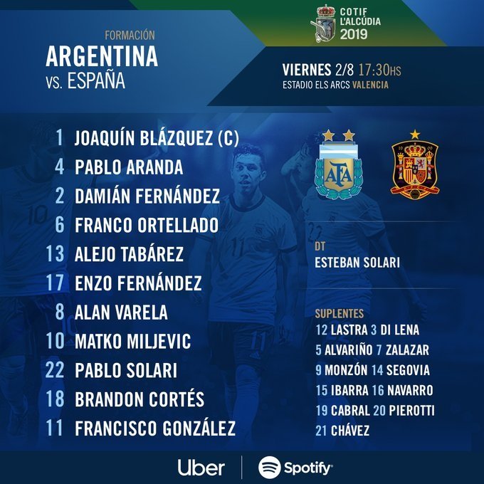 Argentina: Blázquez, Damián Fernández, Aranda, Ortellado, Varela (Pierotti, min. 51), Miljevic, Francisco González (Cabral, min. 73), Tabárez, Enzo Fernández, Brandon Cortés (Salazar, min. 73) y Solari (Chávez, min. 51).