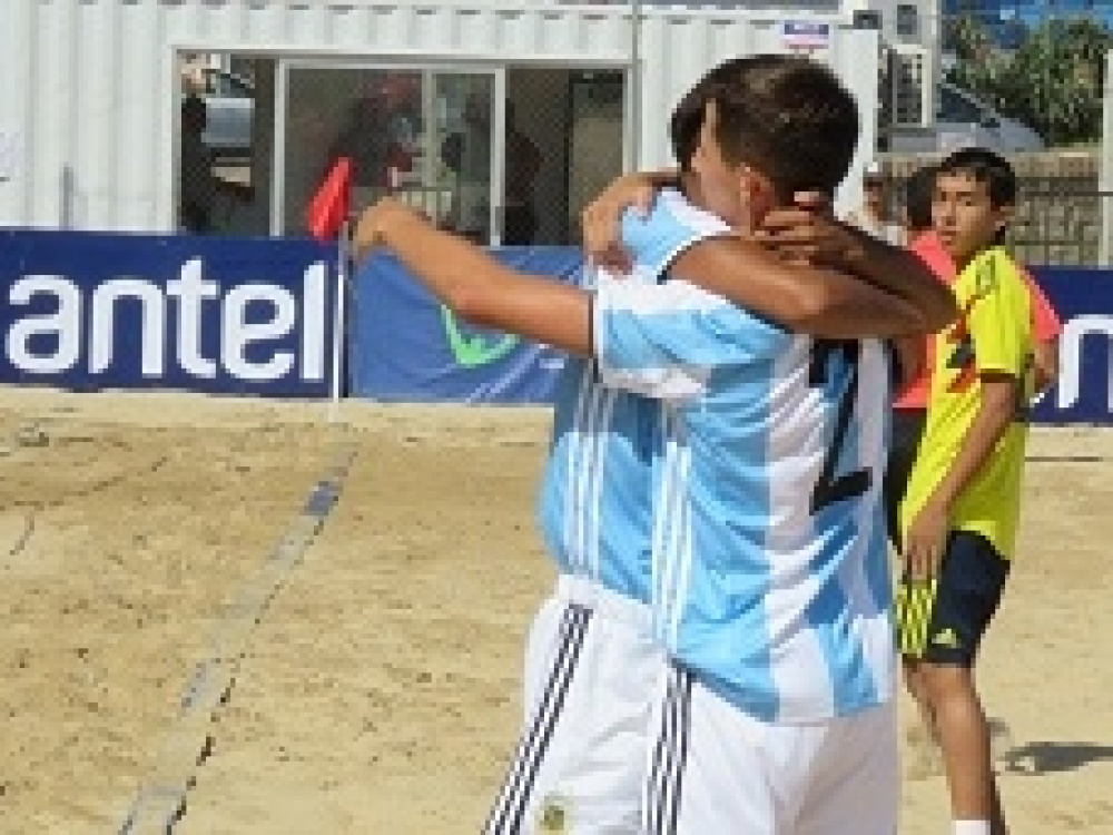 En el estadio Arenas del Plata de la Playa de Pocitos, Argentina consiguió su tercera victoria consecutiva, quedó líder del Grupo A y se clasificó a las semifinales del Sudamericano. Hoy, venció 5-4 a Colombia, con tantos de Guido Noriega, Matías Bravo, Jerónimo Prieto y Lucas Ponzettidio, en dos oportunidades.
