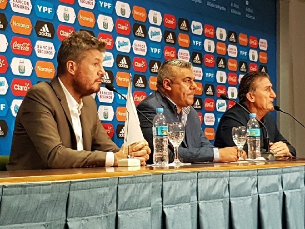 [SELECCIÓN MAYOR] Claudio Tapia en conferencia, junto a Marcelo Tinelli y Edgardo Bauza. pic.twitter.com/gb5iURRsBv