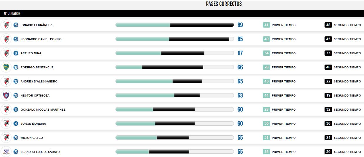 River Play. Luego de la obtención de la segunda Recopa Sudamericana consecutiva, el equipo de Marcelo Gallardo prolongó los festejos en el Monumental, con un partido que además de goles (4-1 ante Banfield), tuvo brillo y mucho toque. Y esto último puede comprobarse con las estadísticas, ya que siete jugadores millonarios integran el top 10 de pases correctos de la primera fecha.