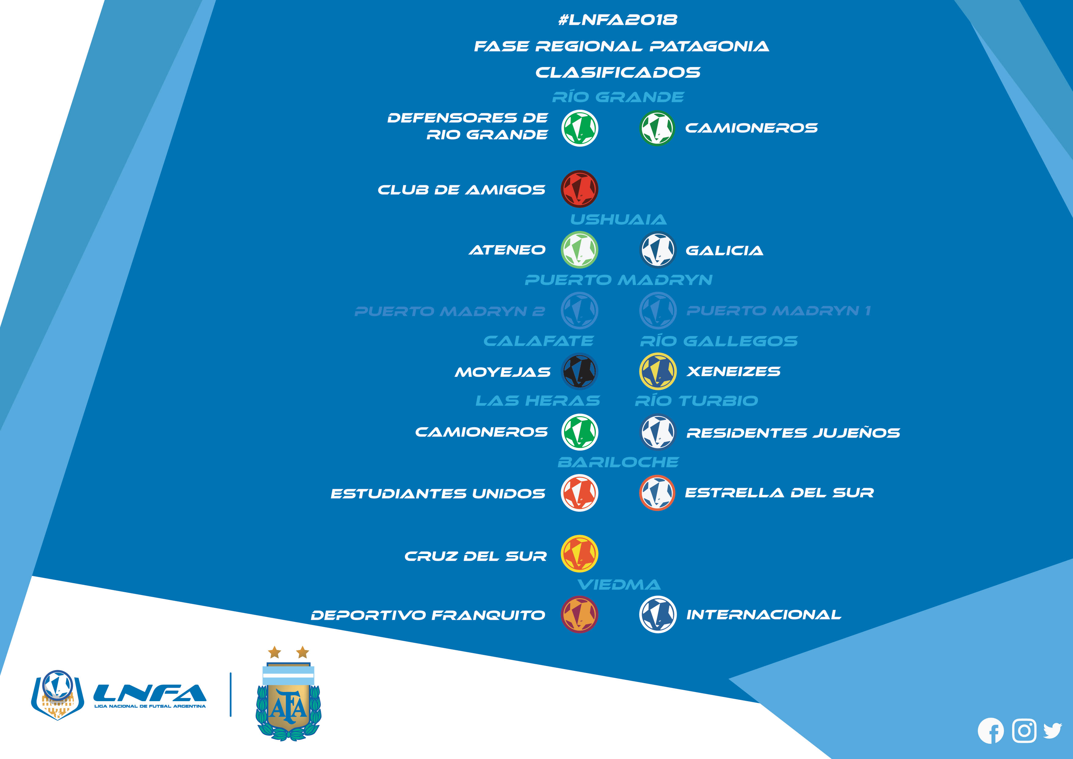 Camioneros (Las Heras); Estrella del Sur, Estudiantes Unidos y Cruz del Sur (Bariloche); Deportivo Franquito e Internacional (Viedma).