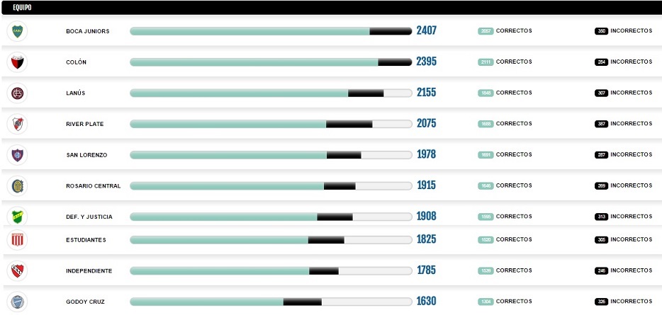 Ahora bien, el volante sabalero es seguido de cerca por Gerónimo Poblete, que además de ser su socio en Colón ostenta 320 pases, promediando un 92,5% de precisión (296 certeros). Y es lógico deducir que esta dupla ayuda a que el club santafesino ocupe la primera posición, en cuanto a la eficacia, en la competencia por equipos: 88,1% da su cuenta, fruto de 2111 balones bien compartidos de un total de 2395 intentos. ¿Qué elenco se lleva el premio si se considera la cantidad de pases absolutos? Boca, con 2407 y un 85,5% de aciertos (2057).