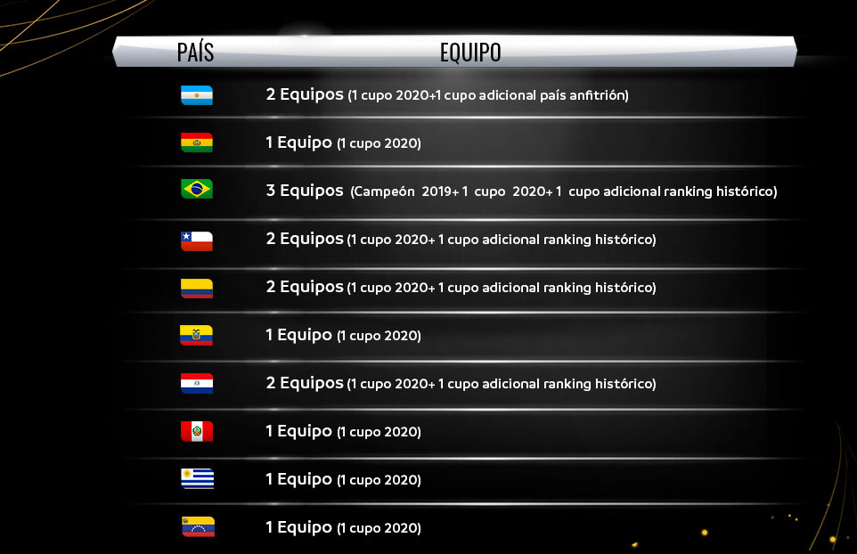 De esta manera, la asignación de cupos de los 16 equipos participantes en la edición de 2020, con el cambio de sede para Argentina, queda de la siguiente manera: