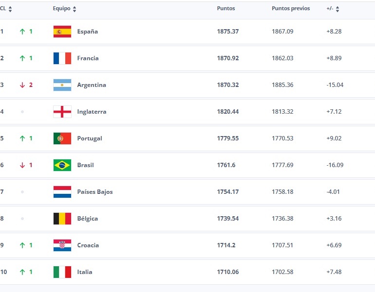 Luego de dos años y cinco meses en la cima del Ranking FIFA, la Selección Argentina que conduce Lionel Scaloni bajó dos puestos tras la derrota por Eliminatorias ante Ecuador. Así quedaron los primeros lugares: