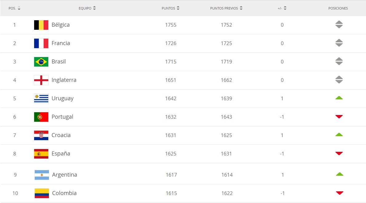 Con 1674 unidades, la Selección Argentina escaló una posición y se posicionó en la novena ubicación del Ranking FIFA. En tanto, Bélgica ocupa el primer puesto con 1755 puntos. Le siguen Francia con 1726 y, en el tercer puesto, Brasil con 1715.