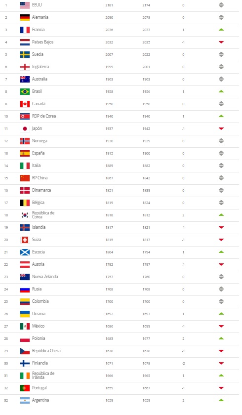 De este modo, Estados Unidos continúa en lo más alto del podio, seguido de Alemania y Francia, que ocupan el segundo y el tercer puesto. En el cuarto lugar, los Países Bajos aventajan a Suecia, Inglaterra y Australia. Brasil, Canadá y la RDP de Corea completan la lista de los diez primeros.