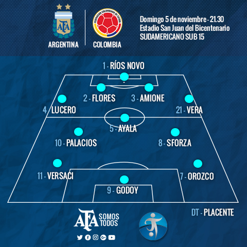 El equipo de Diego Placente dio su primer paso con contundencia: al final del primer tiempo, vencía 3-0 a la selección colombiana. Tras un comienzo con varias oportunidades de gol para la Albiceleste, finalmente fue Matías Godoy el encargado de empujar la pelota a la red. El número nueve abrió el marcador tras una buena jugada colectiva, pasados los 20 minutos iniciales.