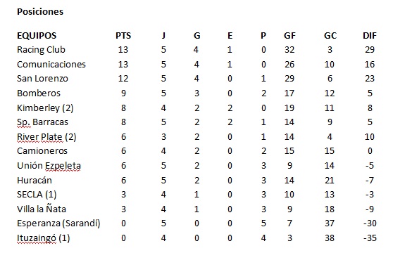 Con este resultado, Bomberos pasa a ocupar el cuarto lugar en la tabla, con 9 puntos en cinco partidos, tabla que lideran Racing y Comunicaciones, con 13 y con San Lorenzo, con doce, como escolta.