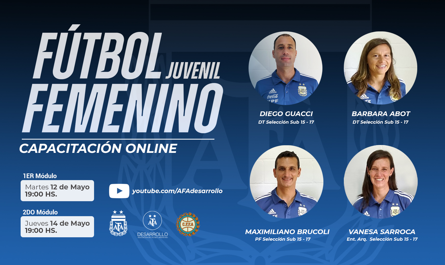 La Asociación de Fútbol Argentino, a través de su Comisión de Desarrollo y con la participación del CFFA, los invita a participar de la capacitación online, dirigida a entrenadores y preparadores físicos de fútbol femenino, que se realizará en dos módulos, los días martes 12 de mayo y jueves 14 de mayo de 2020 a las 19:00hs.