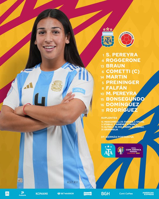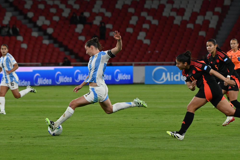 Colombia intentó contrarrestar los ataques argentinos pero no tuvo la profundidad suficiente para inquietar el arco de Solana Pereyra. Sobre el final, un tiro libre de Santos pasó muy cerca del palo, pero el cero se mantuvo hasta final de la primera mitad.