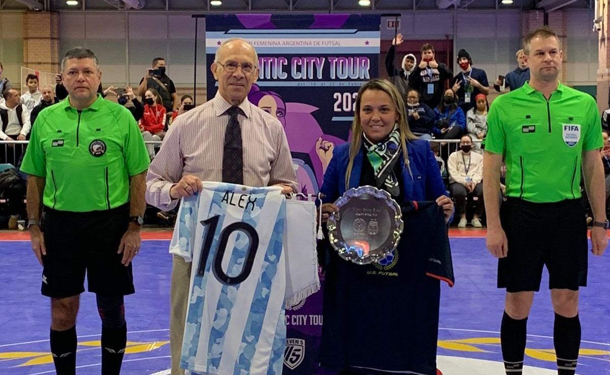 La Presidenta de la Delegación, responsable del Futsal Femenino en la Comisión de Futsal, Verónica Rivero, entregó un presente al Presidente de US Futsal, Alexander Para, organizador de los partidos de la Selección en Atlantic City.