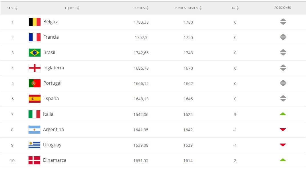 Si bien el orden de las seis primeras plazas no cambia, con el dominio de Bélgica por delante de Francia y Brasil, la 7ª posición pasa a ocuparla ahora Italia (7ª, +3). Asimismo, Dinamarca (10ª, +2), que, al igual que la Squadra Azzurra, ganó sus tres primeros partidos de clasificación para Catar 2022, vuelve a meterse entre las 10 mejores.