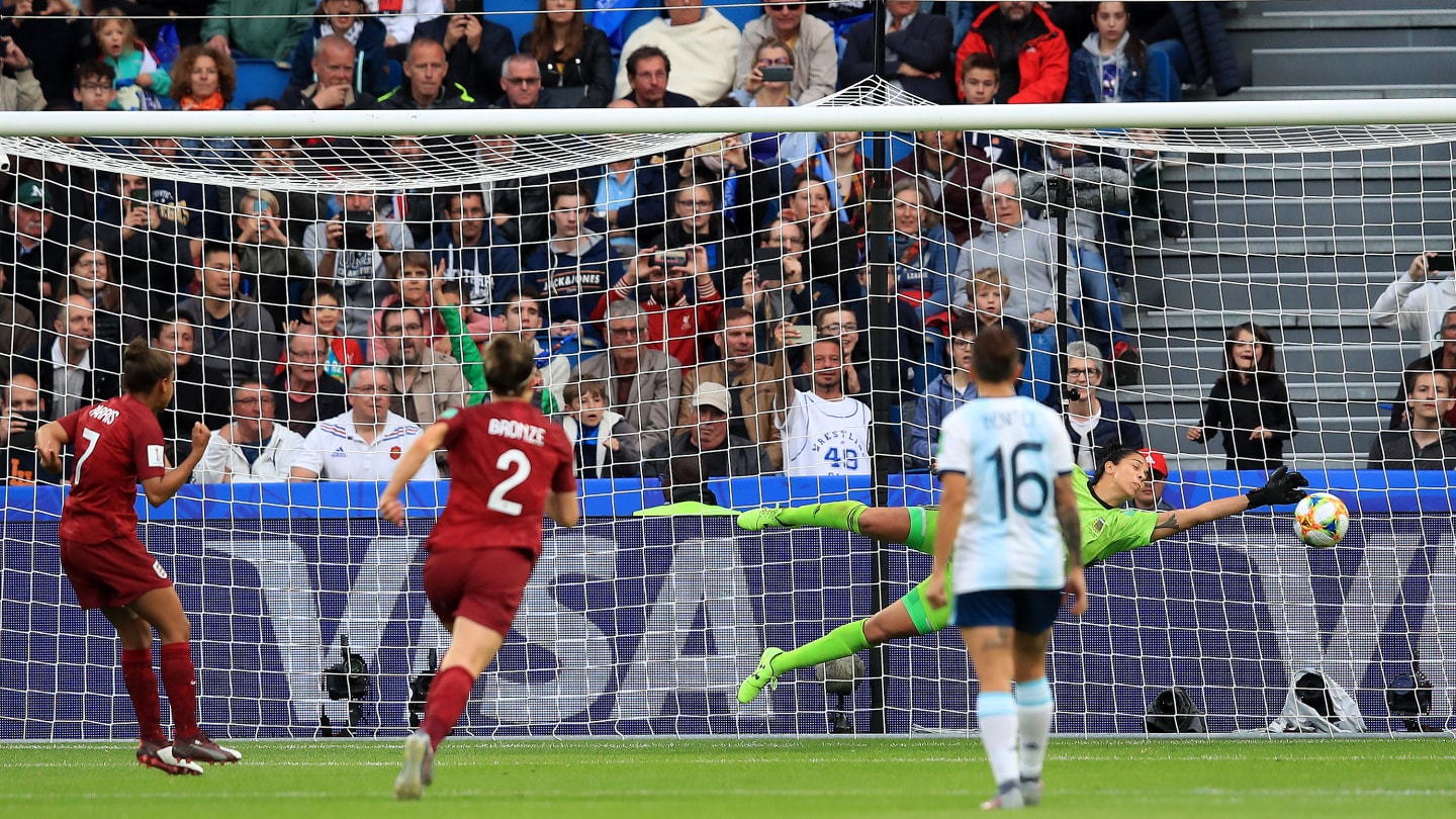 El encuentro ante Inglaterra supuso un esfuerzo aún mayor para las seleccionadas, en desventaja desde el punto de vista físico. Aunque la potencia inglesa se hizo notar en el desarrollo del juego, Argentina opuso una gran resistencia y recién a los 61 minutos del partido, mediante una jugada de contraataque, Jodie Taylor pudo anotar el único gol de la noche en Le Havre. Vanina Correa, su penal atajado y su historia de vida dieron la vuelta a un mundo asombrado por la actuación albiceleste.