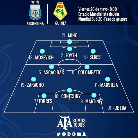 Argentina: Leandro Brey; Joaquín García, Damián Fernández, Bruno Amione y Julio Soler (18m ST Cristian Medina); Alan Varela (18m ST Kevin Lomónaco), Santiago Hezze, Giuliano Simeone (33m ST Gonzalo Luján) y Thiago Fernández (26m ST Lucas Beltrán); Luciano Gondou (26m ST Santiago Castro) y Thiago Almada (C). DT: Javier Mascherano