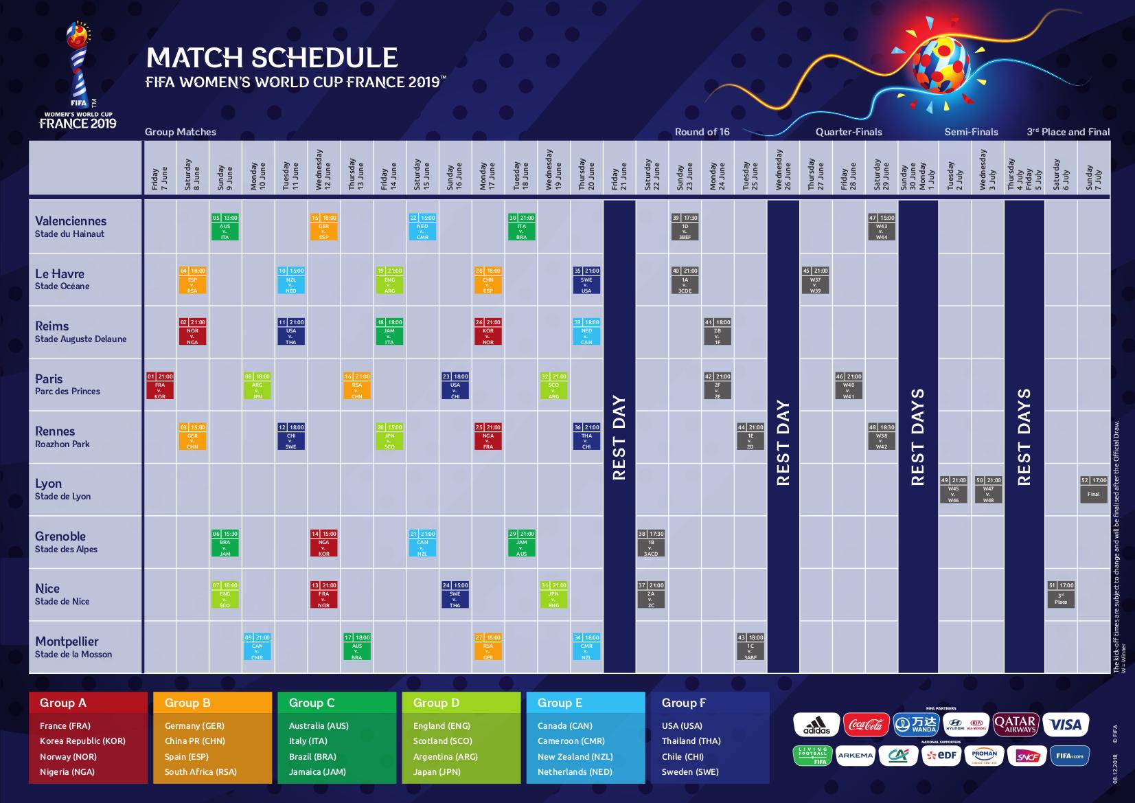 El torneo se celebrará en nueve ciudades anfitrionas: El Havre, Grenoble, Lyon, Montpellier, Niza, París, Reims, Rennes y Valenciennes. Argentina disputará el primer y el último partido de su grupo en París, ante Japón y Escocia, respectivamente. El encuentro frente a Inglaterra tendrá lugar en la ciudad de El Havre.