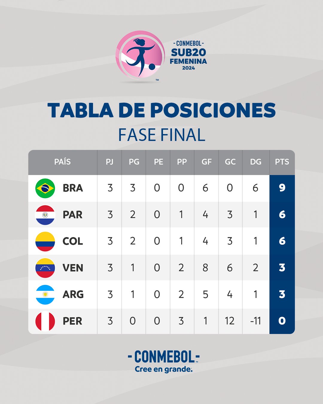 Brasil es líder de la Fase Final con nueve puntos y primer clasificado al Mundial, le siguen Paraguay y Colombia con siete unidades, Argentina con cuatro, Venezuela con tres y, en la última posición, Perú con una unidad y una diferencia de 11 goles en contra.