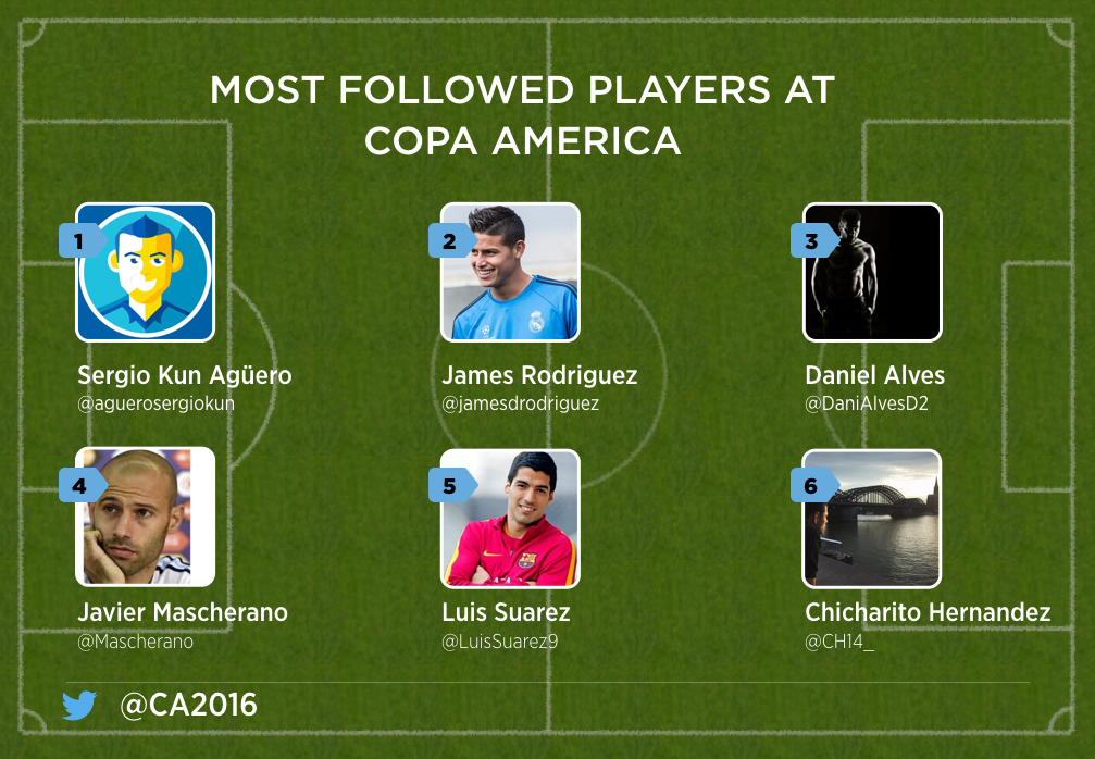 Suma casi diez millones. Ésa es la cantidad de followers que tiene el delantero de Argentina en una de las plataformas sociales con mayor arraigo en el mundo futbolero. Sí, Agüero es, entre todos los jugadores que participarán con las 16 selecciones de la edición centenaria de la Copa América, el hombre top en Twitter.