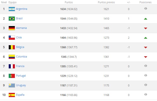 Como viene ocurriendo desde el mes de abril, la Selección Argentina lidera el ranking FIFA con 1.634 puntos. La victoria ante Colombia en San Juan le permitió al elenco que conduce Edgardo Bauza mantener la posición de vanguardia. Su escolta es Brasil, 90 unidades detrás. Alemania, Chile y Bélgica completan el listado de los 5 primeros.
