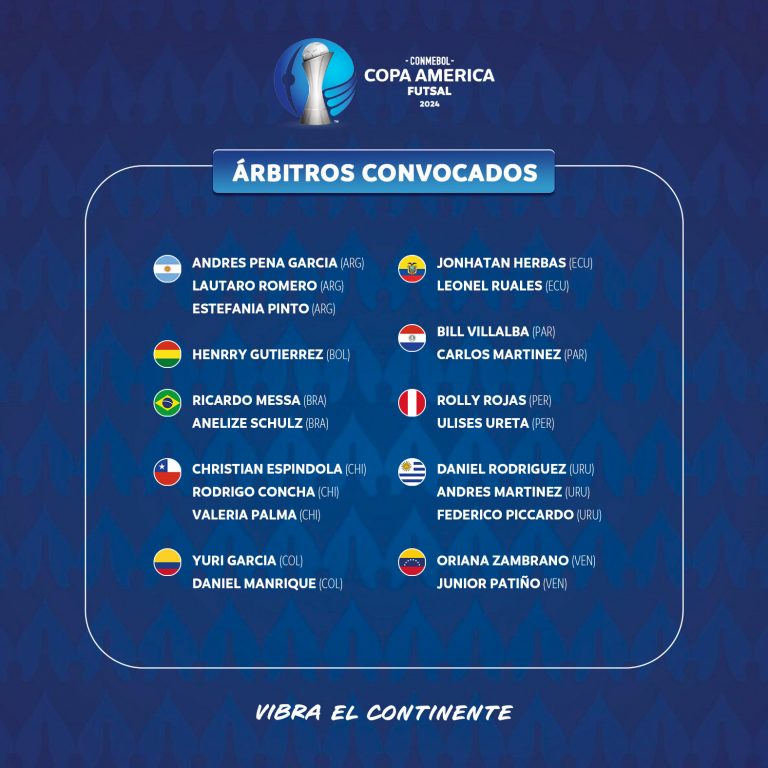 La Comisión de Árbitros de la CONMEBOL dio a conocer la designación de árbitros para la CONMEBOL Copa América™ Futsal 2024, que se disputará del 02 al 10 de febrero en el COP Arena, de la ciudad de Luque – Paraguay.