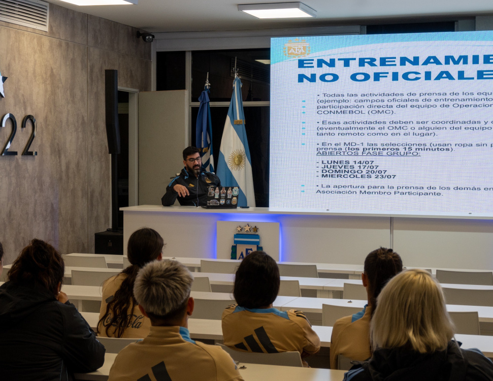 En la exposición sobre prensa se le mostraron a las futbolistas diferentes diapositivas con los requerimientos y obligaciones que debe afrontar en plantel en una competencia de tal envergadura. Además, se les informó sobre los mecanismos de comunicación en canales oficiales y no oficiales durante el certamen.