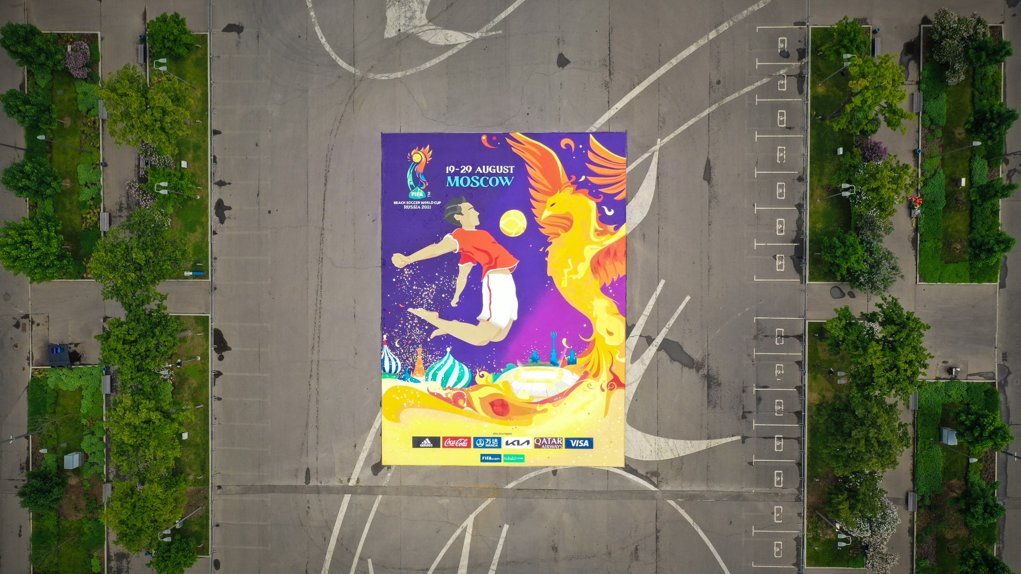 El cartel se presentó el jueves, 3 de junio, en una lona de 24x33 metros instalada en el lugar donde próximamente se levantará el recinto que albergará la Copa Mundial de Beach Soccer de la FIFA, junto al Estadio Luzhnikí. Fueron necesarios cinco días para completar la obra. Si desea ver cómo cobró vida el lienzo, no se pierda el vídeo oficial.