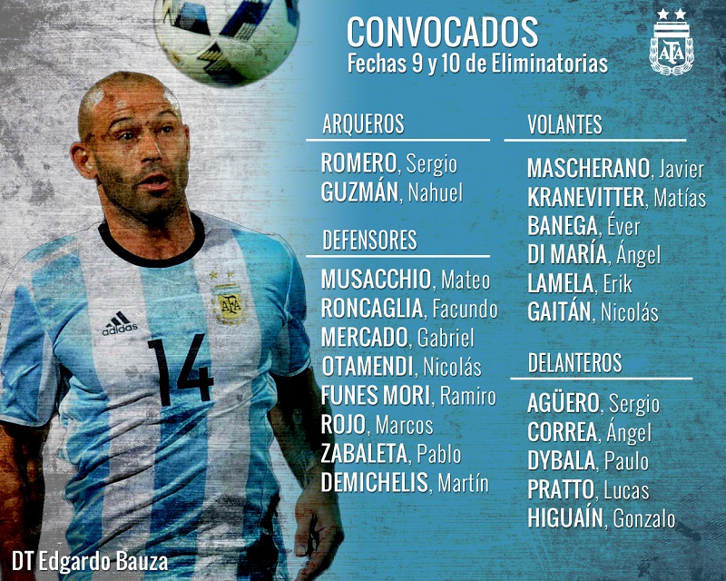 El camino hacia Rusia 2018 ofrece dos nuevos desafíos. La Selección se medirá el 6 de octubre ante Perú, en Lima, y el 11 frente a Paraguay, en Córdoba. Esta es la nómina de 21 citados del fútbol del exterior luego de que Lionel Messi, Augusto Fernández y Lucas Biglia quedaran desafectados por lesión. A continuación, el detalle.