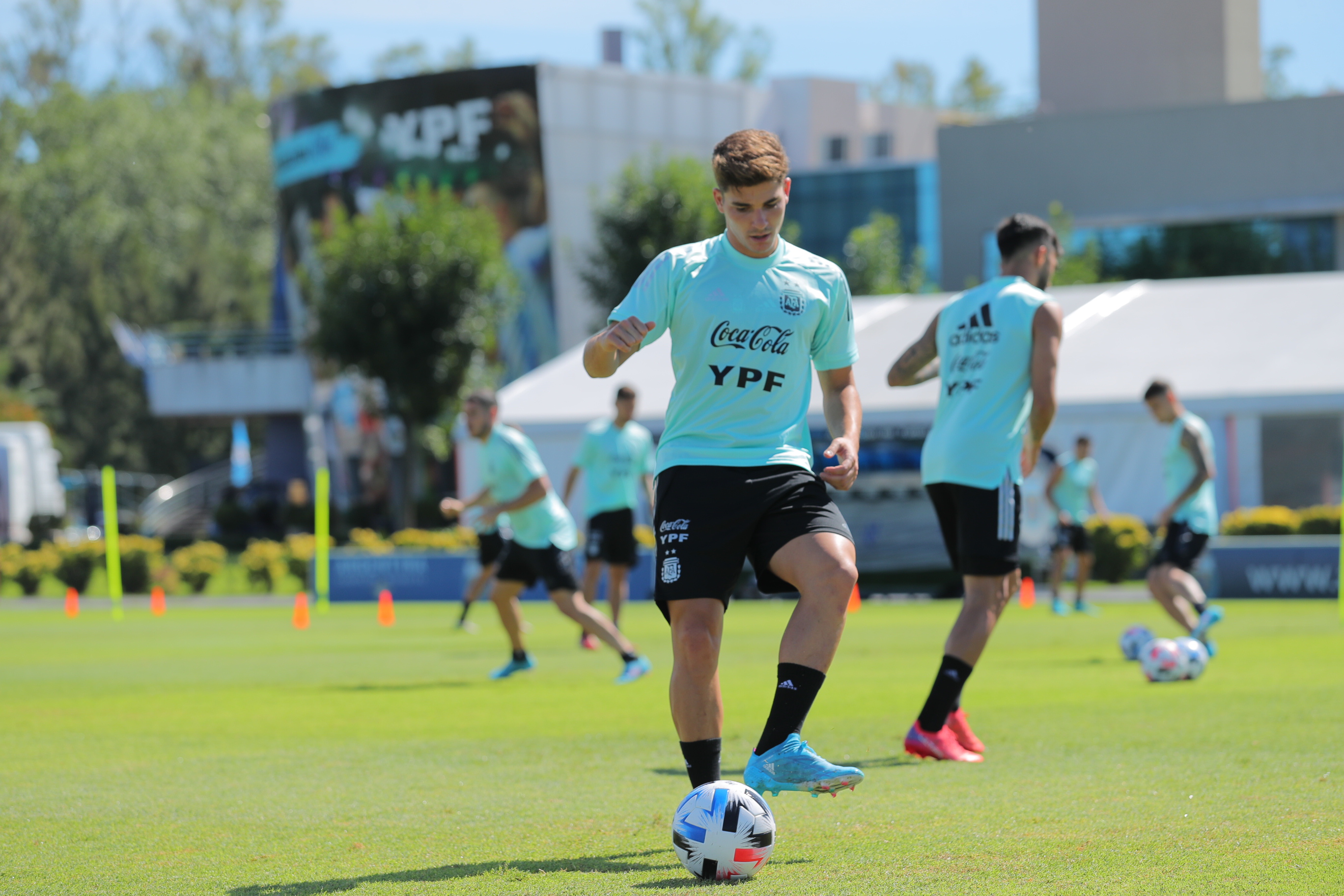 Los dirigidos por Scaloni iniciaron las labores en el gimnasio y luego saltaron al campo de juego para realizar circuitos técnicos con balón y juegos recreativos con consignas.