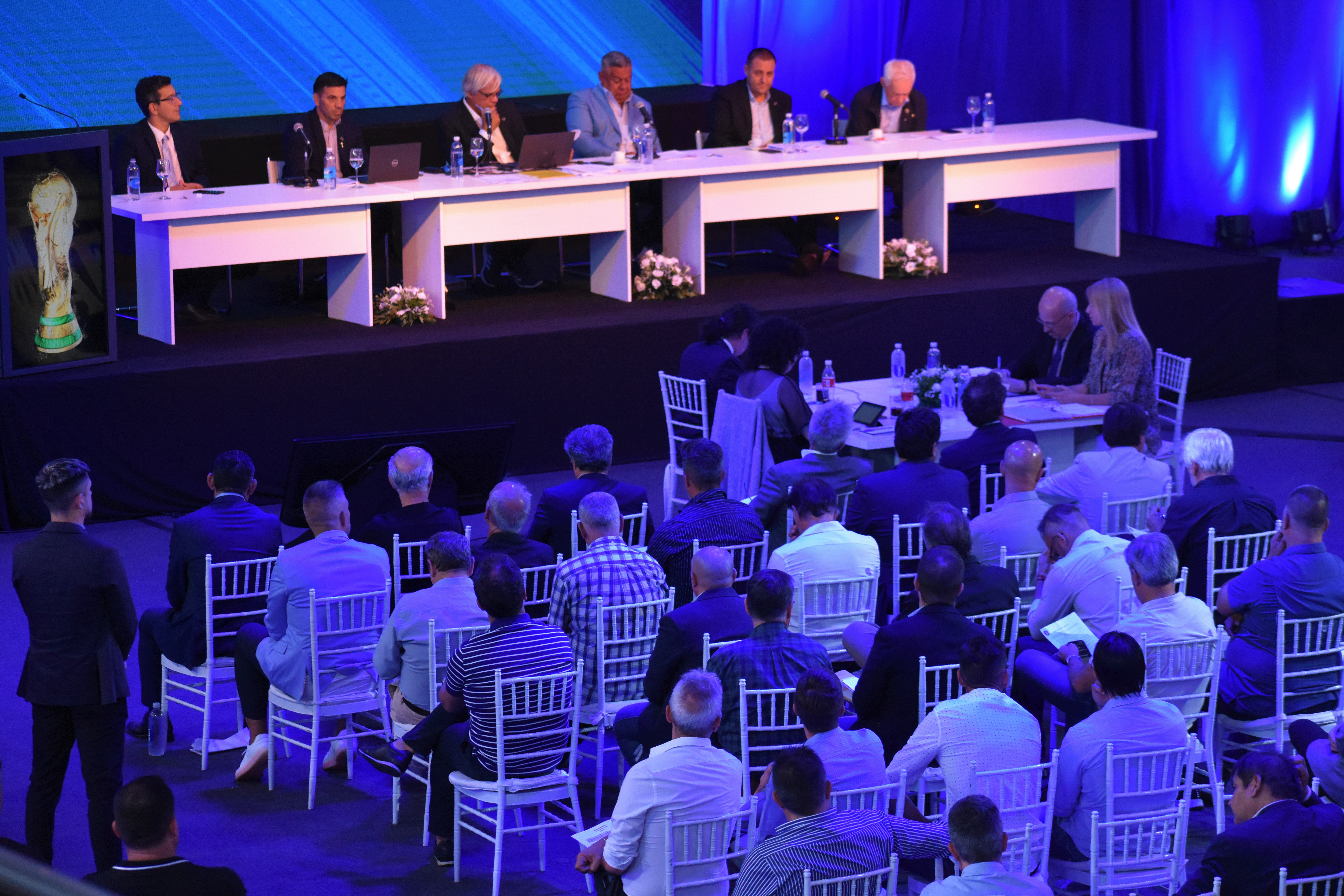 Esta tarde, en el predio de Ezeiza, se llevó a cabo la Asamblea Ordinaria y Extraordinaria de la Asociación del Fútbol Argentino. Claudio Tapia, Presidente de la AFA; ingresó al salón junto con el trofeo de la Copa del Mundo y expresó ante los presentes: